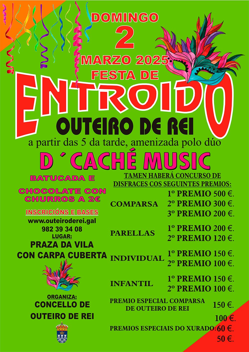 Con motivo da FESTA DE ENTROIDO 2025, o Concello de Outeiro de Rei organiza o XXVI CONCURSO DE DISFRACES; a cita terá lugar o día 2 de marzo (domingo de Entroido) a partir das 17:00 h na Praza da Vila, baixo carpa cuberta e estará amenizada polo Grupo D´CACHÉ MUSIC, haberá ademais BATUCADA e CHOCOLATE CON CHURROS ao prezo especial de 2 €.