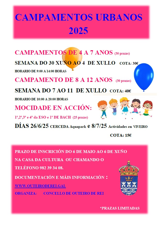 O Concello de Outeiro de Rei abre o prazo de inscrición para os CAMPAMENTOS URBANOS que se realizaran do 30 de xuño ao 4 de xullo para os nenos e nenas de 4 a 7 anos e do 7 ao 11 de xullo para os nenos e nenas de 8 a 12 anos.