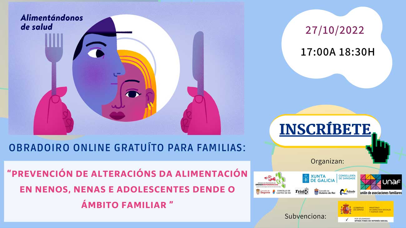 O servizo de prevención de condutas adictivas da agrupación de Concellos de Begonte, Castro de Rei, Friol, Outeiro de Rei e Rábade organiza un encontro online dirixidos a nais e pais para abordar a prevención de condutas alimentarias de risco dende o ámbito familiar.