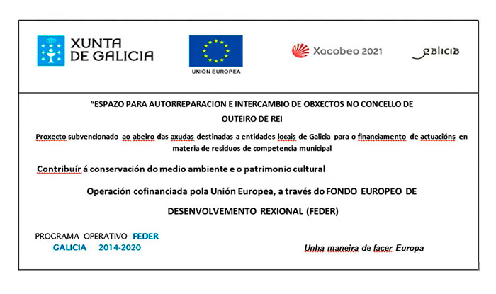 Ao abeiro da Orde do 5 de maio de 2020, da Consellería de Medio Ambiente, Territorio e Vivenda, pola que se establecen as bases reguladoras para a concesión de axudas a entidades locais de Galicia para o financiamento de actuacións en materia de residuos de competencia municipal, cofinanciadas polo Fondo Europeo de Desenvolvemento Rexional con cargo ao programa operativo Feder Galicia 2014-2020, ao Concello de Outeiro de Rei se lle concedeu unha axuda de 30.000 € para a realización do proxecto Espazo para autorreparación e intercambio de obxectos.