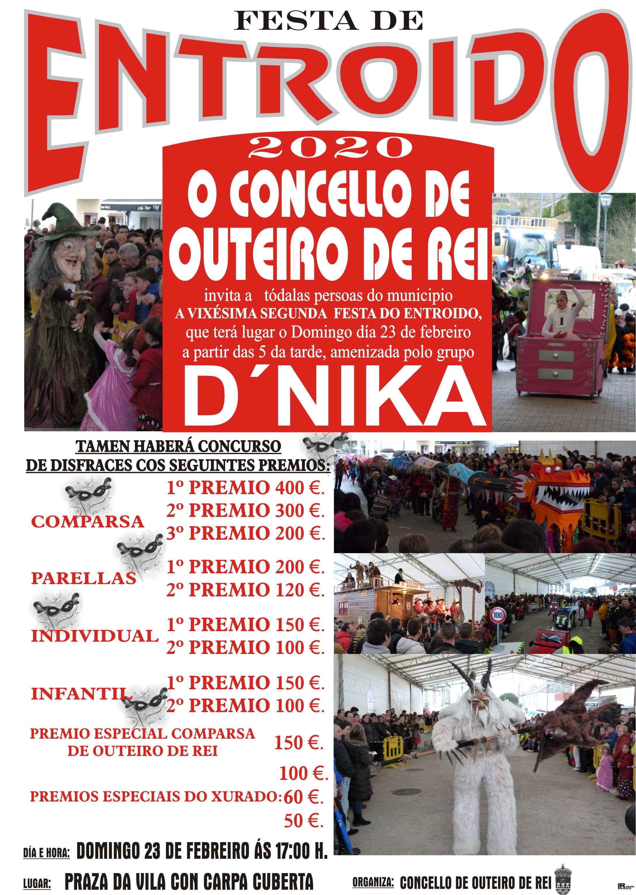 Con motivo da FESTA DE ENTROIDO 2020, o Concello de Outeiro de Rei organiza a XXII edición do tradicional CONCURSO DE DISFRACES; a cita terá lugar o día 23 de febreiro (domingo de Entroido) a partir das 17:00 h na Praza da Vila, baixo carpa cuberta e amenizado polo Trío D´Nika.