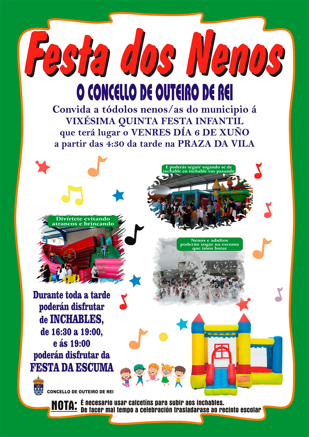 O Concello de Outeiro de Rei organiza para o venres día 6 de xuño a XXV FESTA DOS NENOS E DAS NENAS, na que o público infantil e a rapazada poderán gozar de diferentes inchables, kars e tobogáns de forma gratuíta en horario de 16:30 h ata as 19:00 h.
