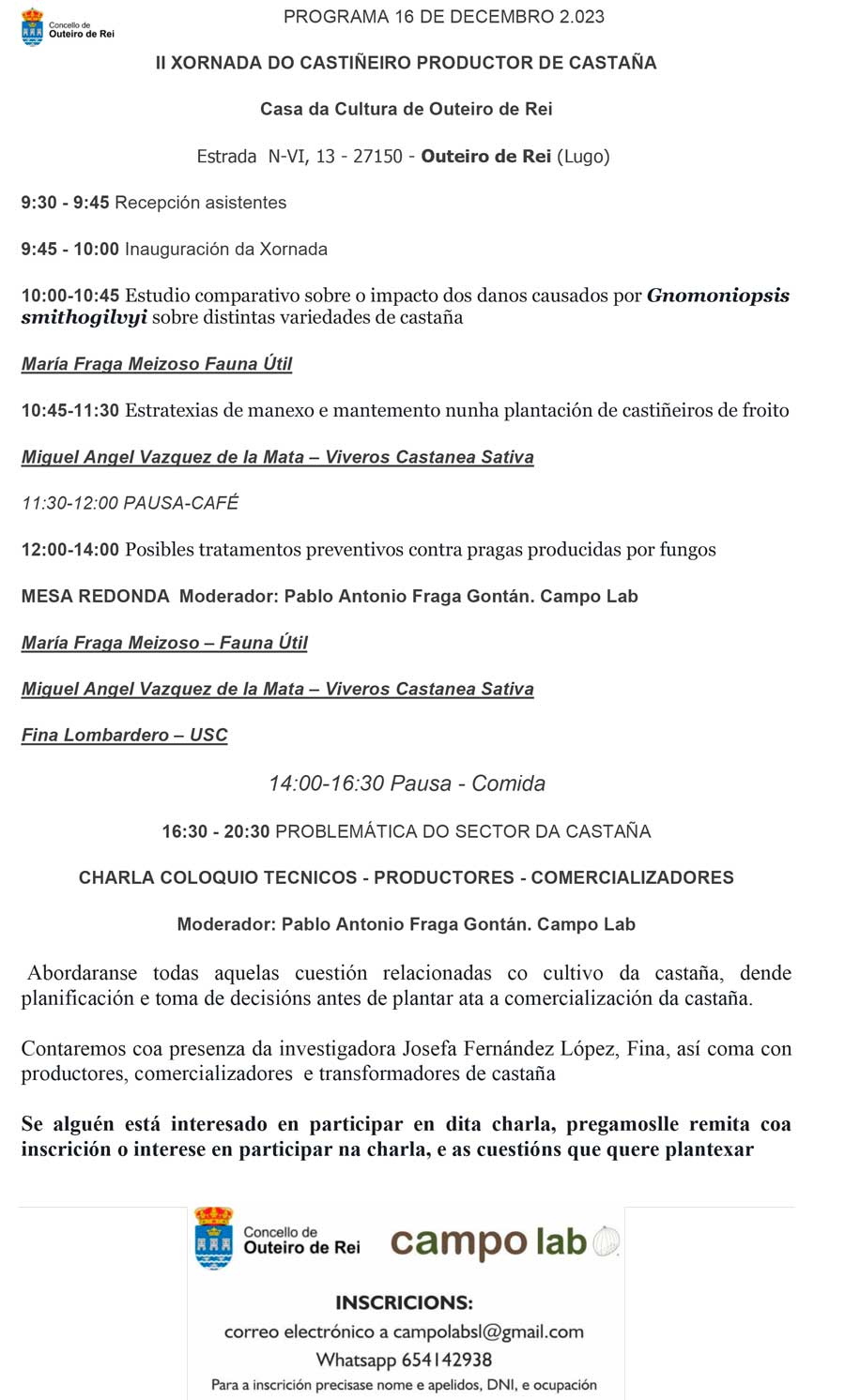 O día 16 de decembro de 2023 terá lugar na Casa da Cultura de Outeiro de Rei a II XORNADA DO CASTIÑEIRO PRODUTOR DE CASTAÑA organizada pola empresa CampoLab que contará coa presencia de María Fraga Meizoso de Fauna Útil, Miguel Ángel Vázquez de la Mata de Viveros Castanea Sativa, Fina Lombardero da USC e a investigadora Josefa Fernández López que xunto co enxeñeiro da empresa organizadora, Pablo Antonio Fraga Gontán, abordaran cuestións relacionadas co cultivo da castaña, dende a planificación e toma de decisións antes de plantar ata a comercialización deste produto e outras cuestións como tratamentos preventivos contra pragas producidas por fungos.