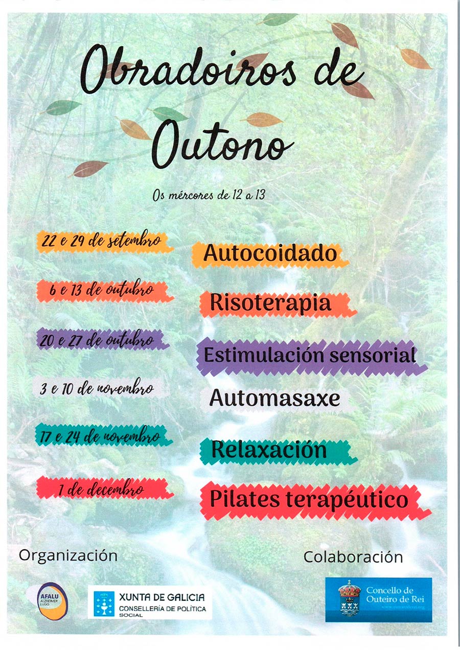 Os obradoiros serán: autocoidado, risoterapia, estimulación sensorial, automasaxe, relaxación e pilates terapéutico.